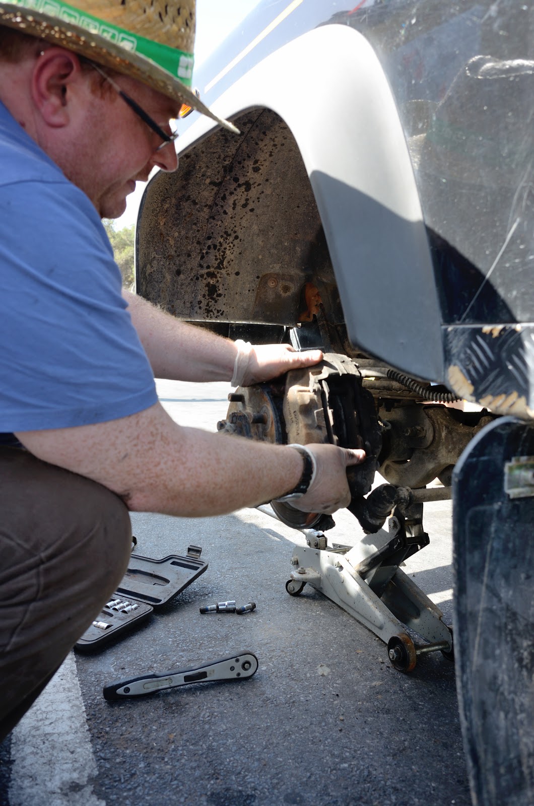 Deuxième arrêt aux stands sur une aire d'autoroute pour changer un roulement sur le Land de Tim. Charlie a l'équipement d'un garage dans Archie et travaille plus vite que le mécano d'une écurie de formule un.